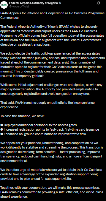 The Federal Airports Authority of Nigeria (FAAN) said the cashless system is expected to improve vehicular processing speed, enhance transparency, and boost operational efficiency at airport access points.