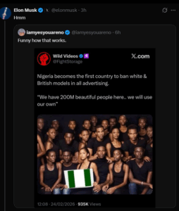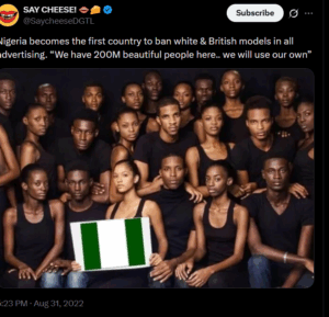 A viral post circulating on social media, especially on X, claims Nigeria has become the first country to ban “white & British models” in all advertising. The post includes the quote: “We have 200M beautiful people here… we will use our own.”