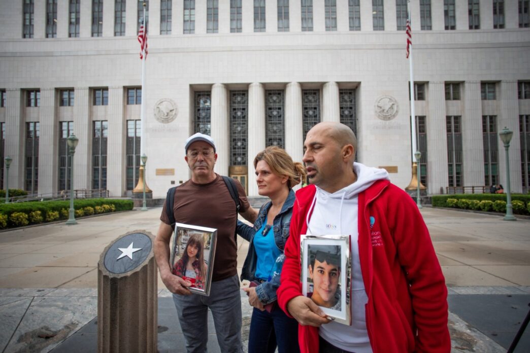 Parents from the United Kingdom George Nicolaou (L) Mariano Janin (C), and Ellen Roome Cheltenham (R) arrive holding photos of their children who took their own lives outside the Los Angeles County Superior Court in Los Angeles, on February 11, 2026. Arguments began February 9 in a landmark US trial that could establish a legal precedent on whether social media companies deliberately designed their platforms to lead to addiction in children. The case in Los Angeles Superior Court is being seen as a bellwether proceeding because its outcome could set the tone for a tidal wave of similar litigation across the United States. (Photo by Apu GOMES / AFP)