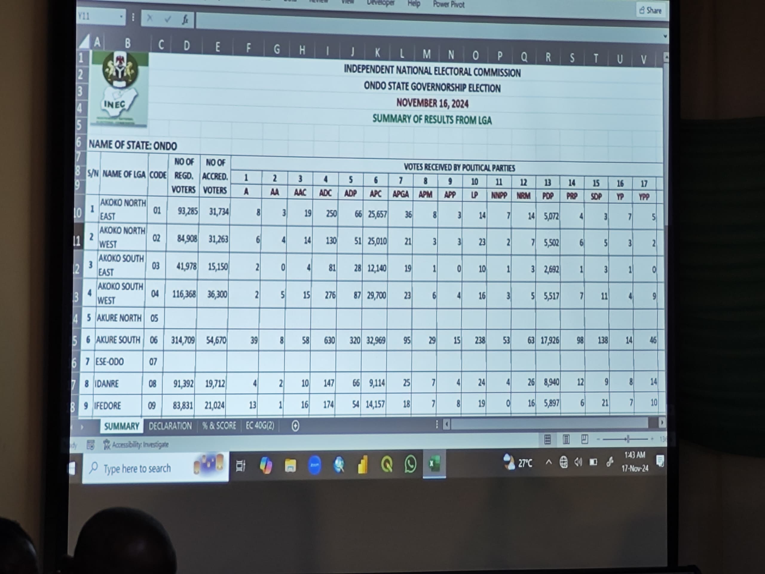 With results from three Local Government Areas (LGAs) still pending, final collation began at 12:35 am at the INEC office in Akure, the state capital. The Returning Officer, Prof. Olayemi Akinwunmi, Vice Chancellor of the Federal University of Lokoja, is overseeing the process.
