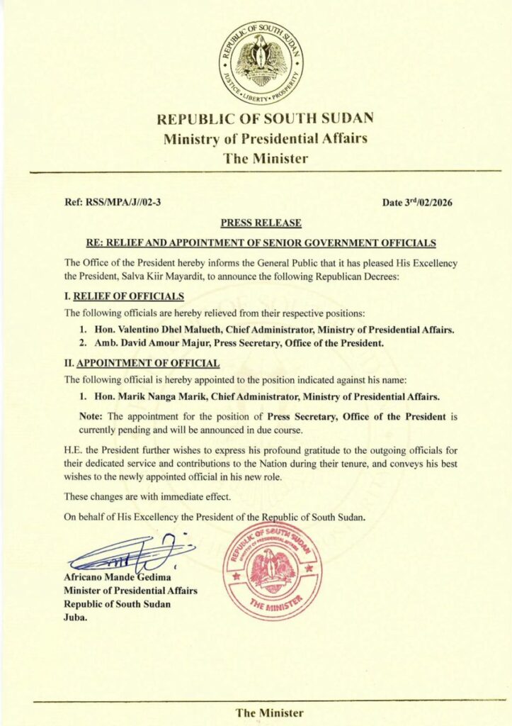 Marik Nanga Marik will take over as the Ministry of Presidential Affairs’ new Chief Administrator, replacing Malueth.