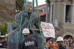 Students surround the bronze statue of British colonialist Cecil Rhodes, as it is removed from the campus of Cape Town University, South Africa. [File:AP/Schalk van Zuydam]